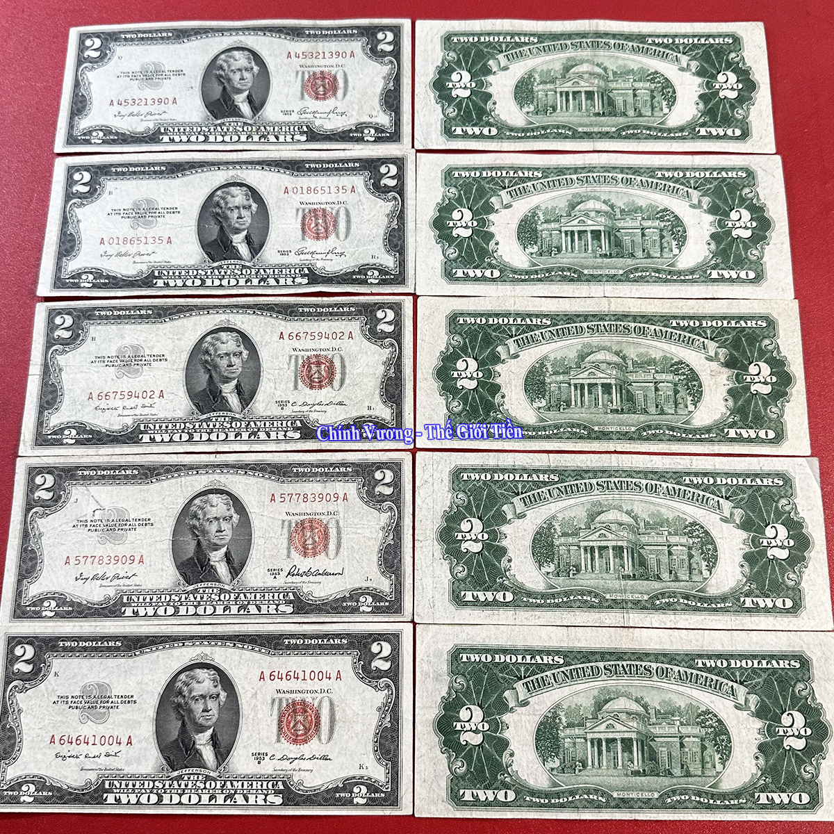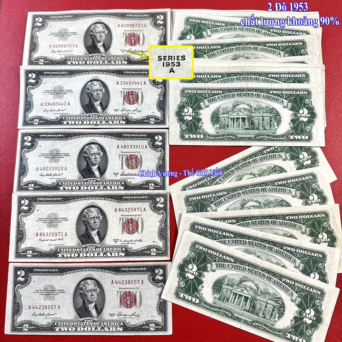 ♦ Tiền 2 Đô 1953 Mộc Đỏ, Seri Đỏ, mặt trước là hình ngài tổng thống Jefferson, mặt sau là dinh thự của ngài.