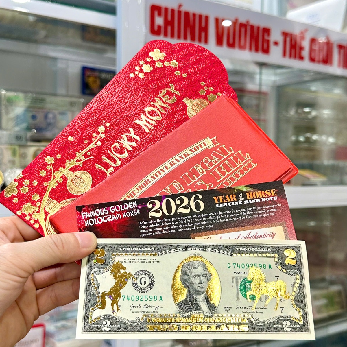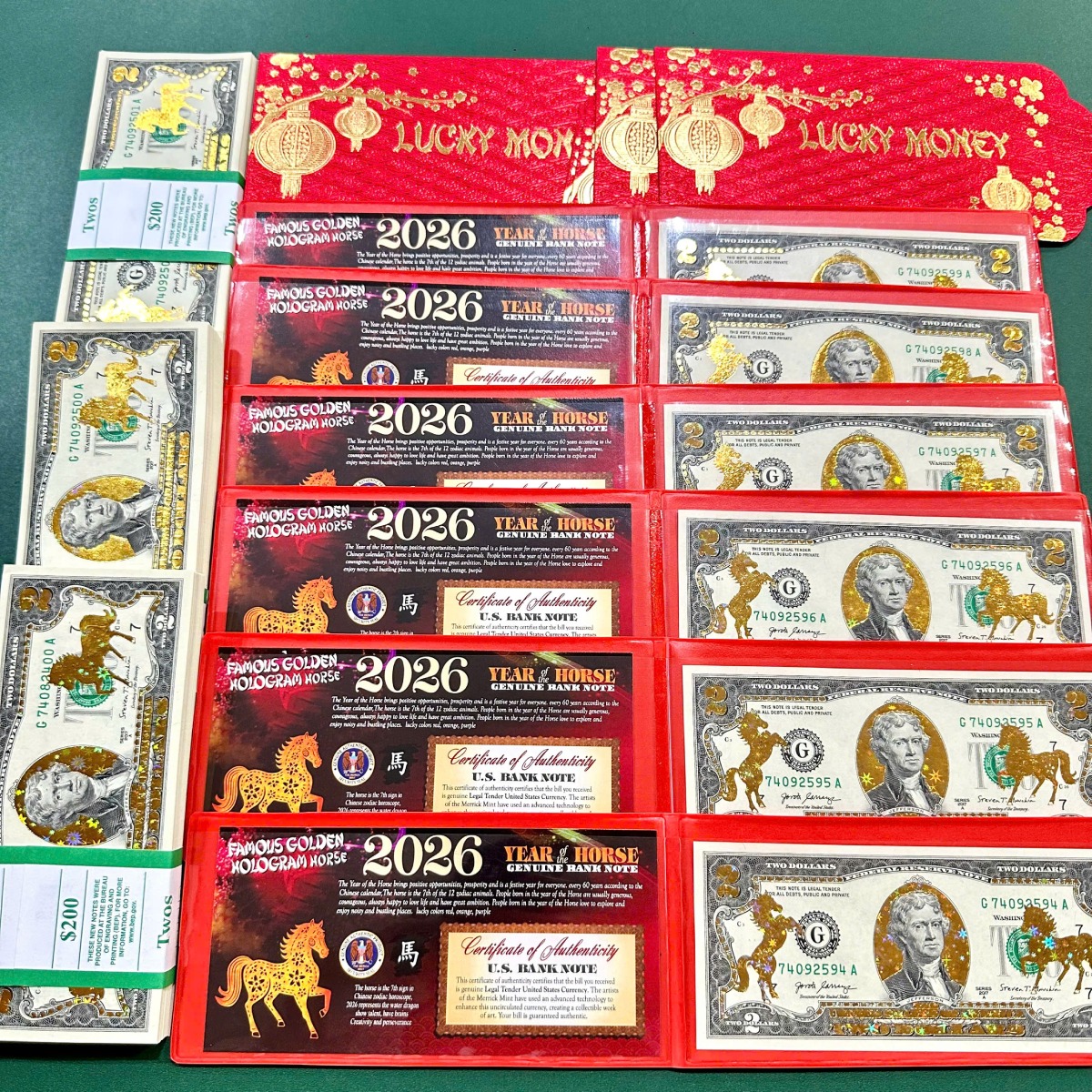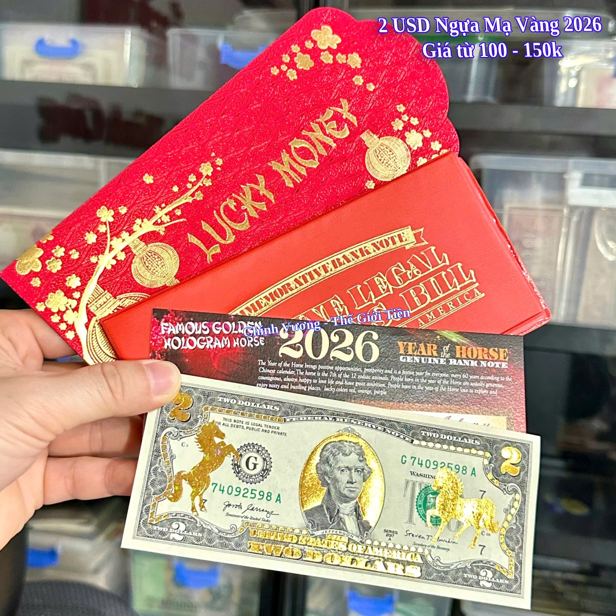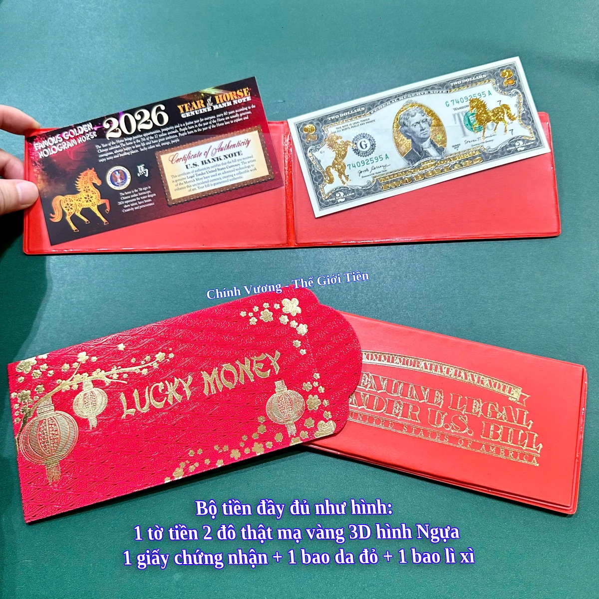 Tiền 2 Đô Ngựa Mạ Vàng 3D Ngôi Sao được in trên nền tờ tiền thật, được mạ vàng và chế tác thêm hình 2 con Ngựa và các hoa văn để tăng vẻ đẹp của tờ 2 đô. Mỗi bộ đều có phụ kiện đi kèm theo.