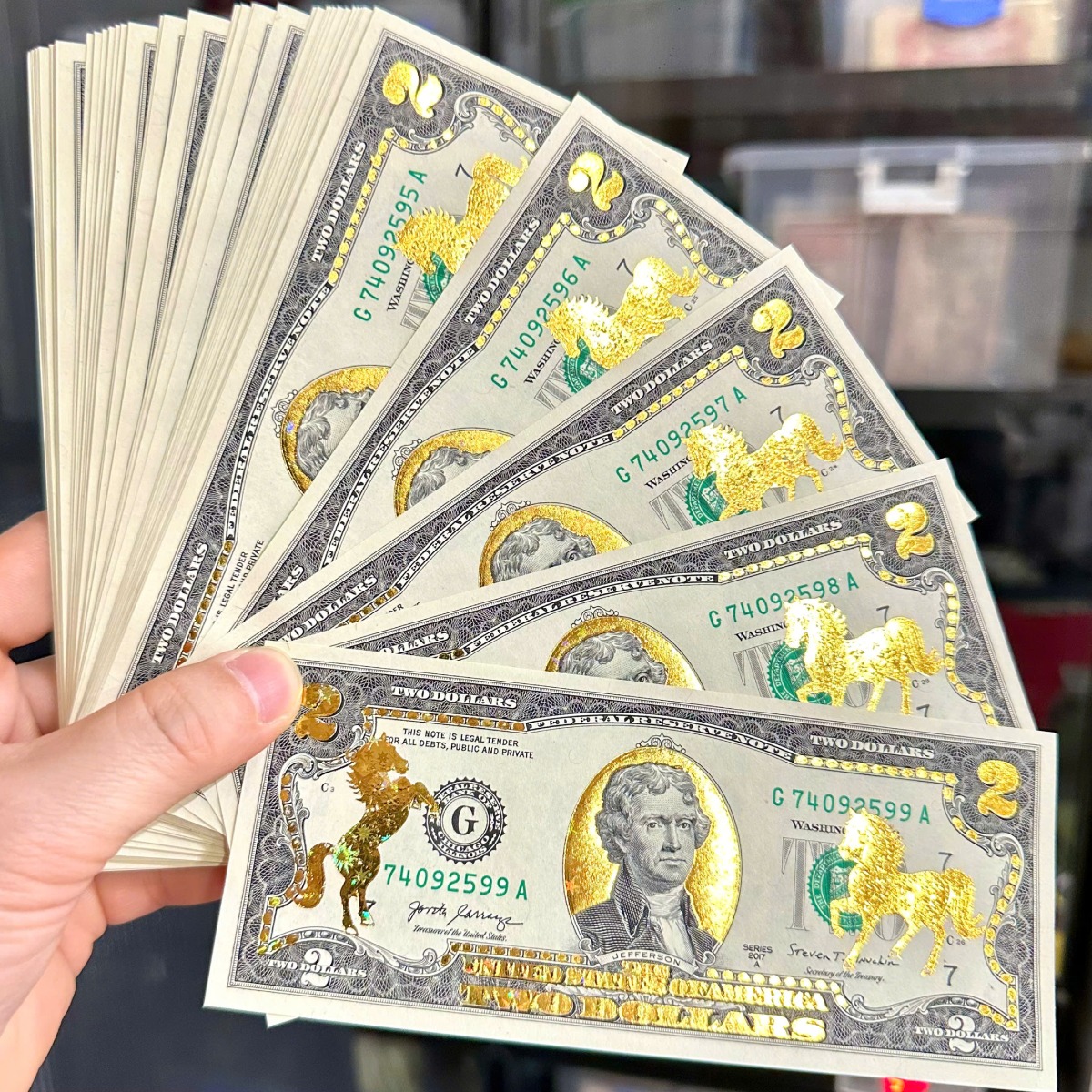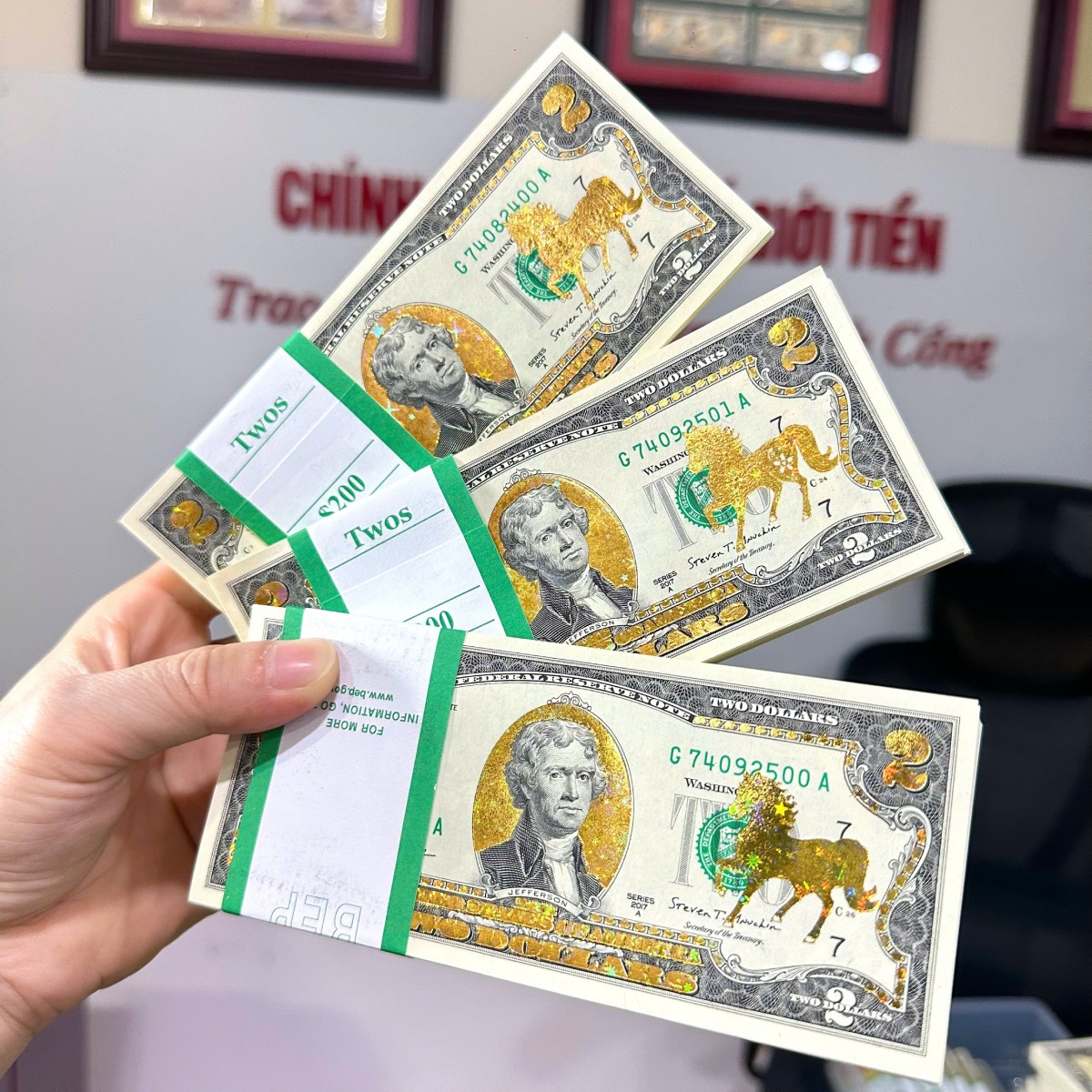 Cận cảnh tờ 2 đô Ngựa mạ vàng 3D ngôi sao Chính Vương có số lượng lớn giá cực tốt tiền 2 đô Ngựa mạ vàng 3D ngôi sao này