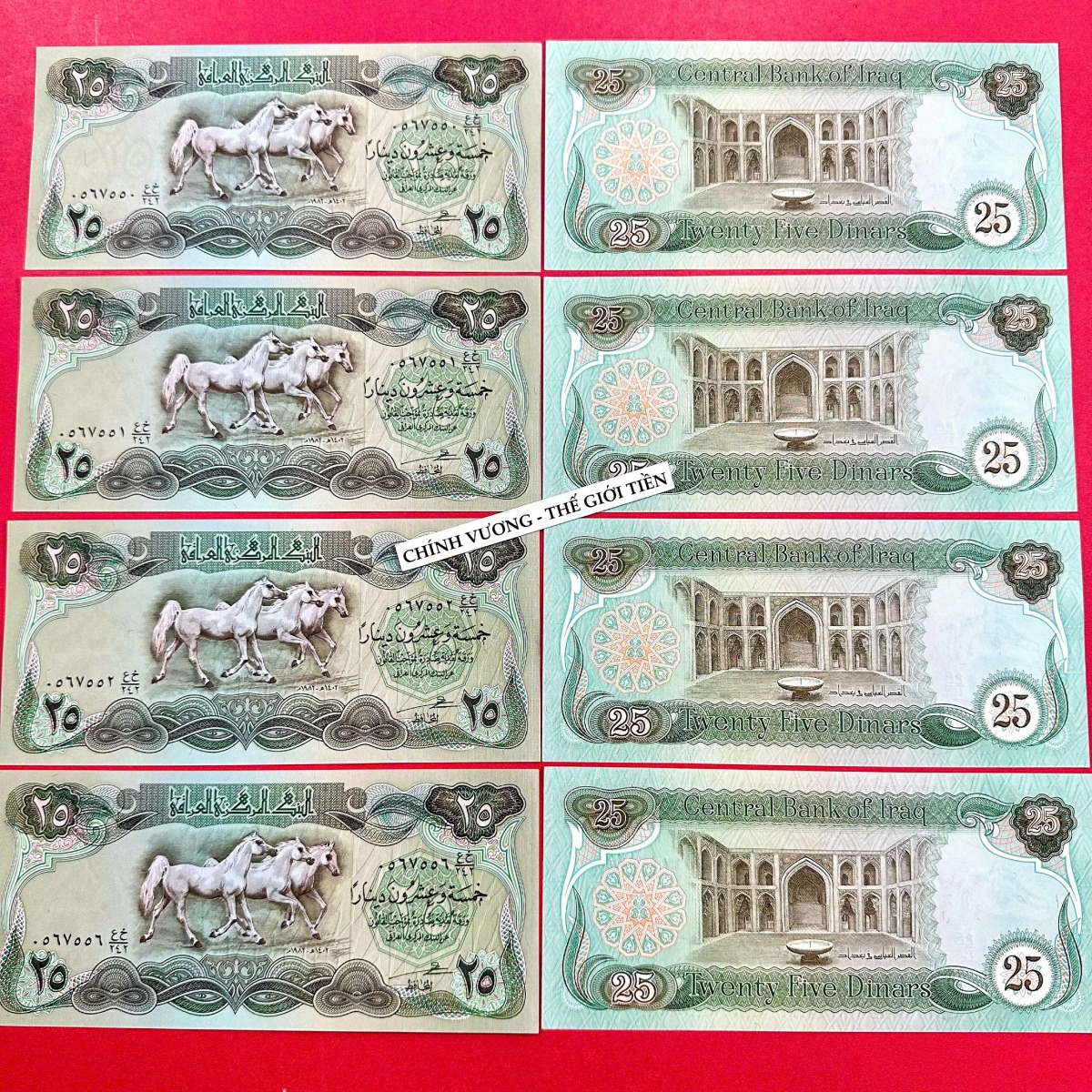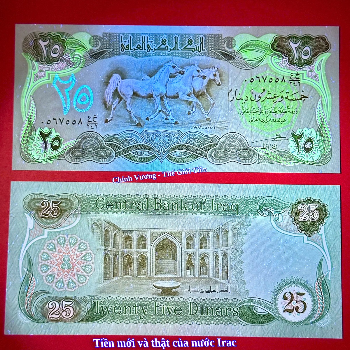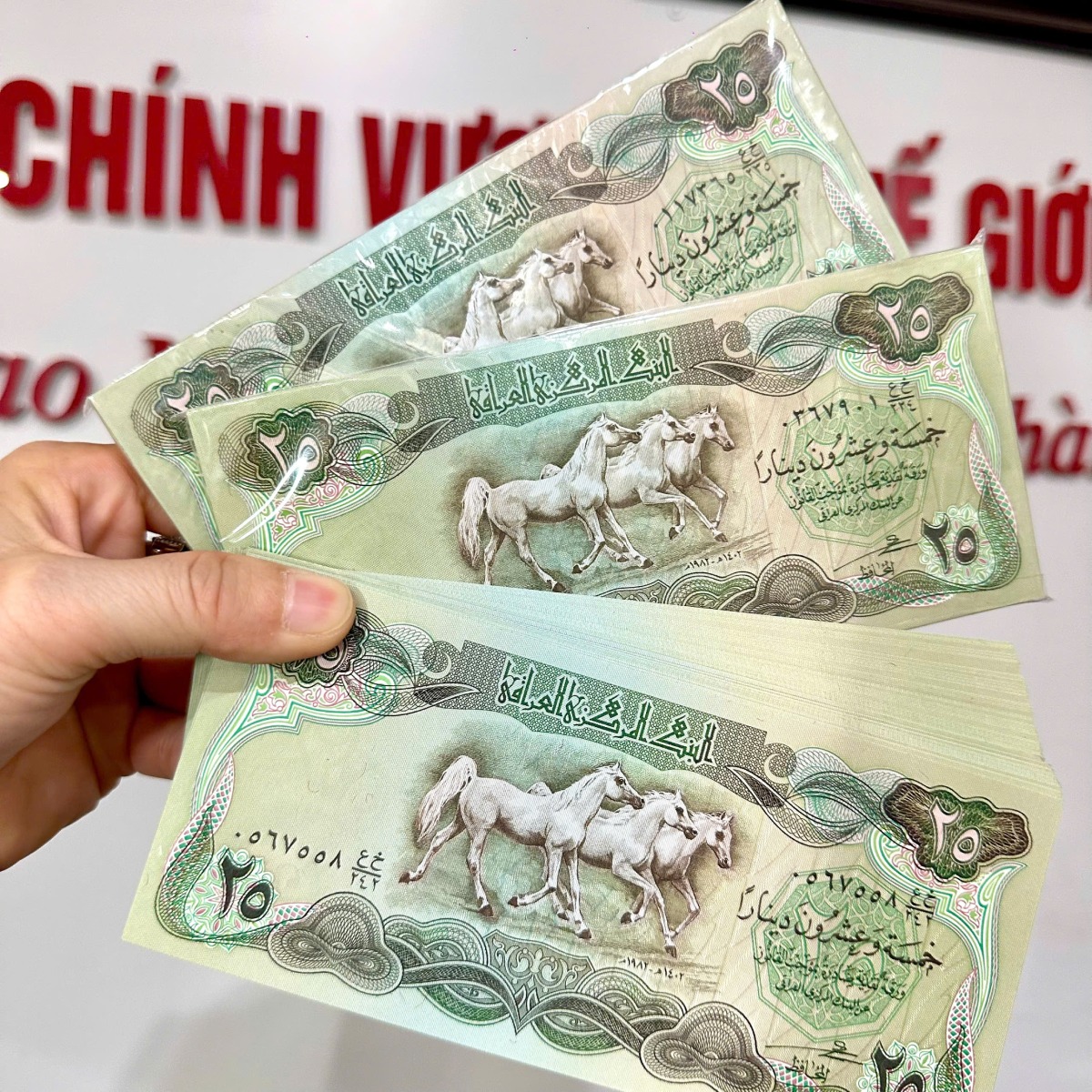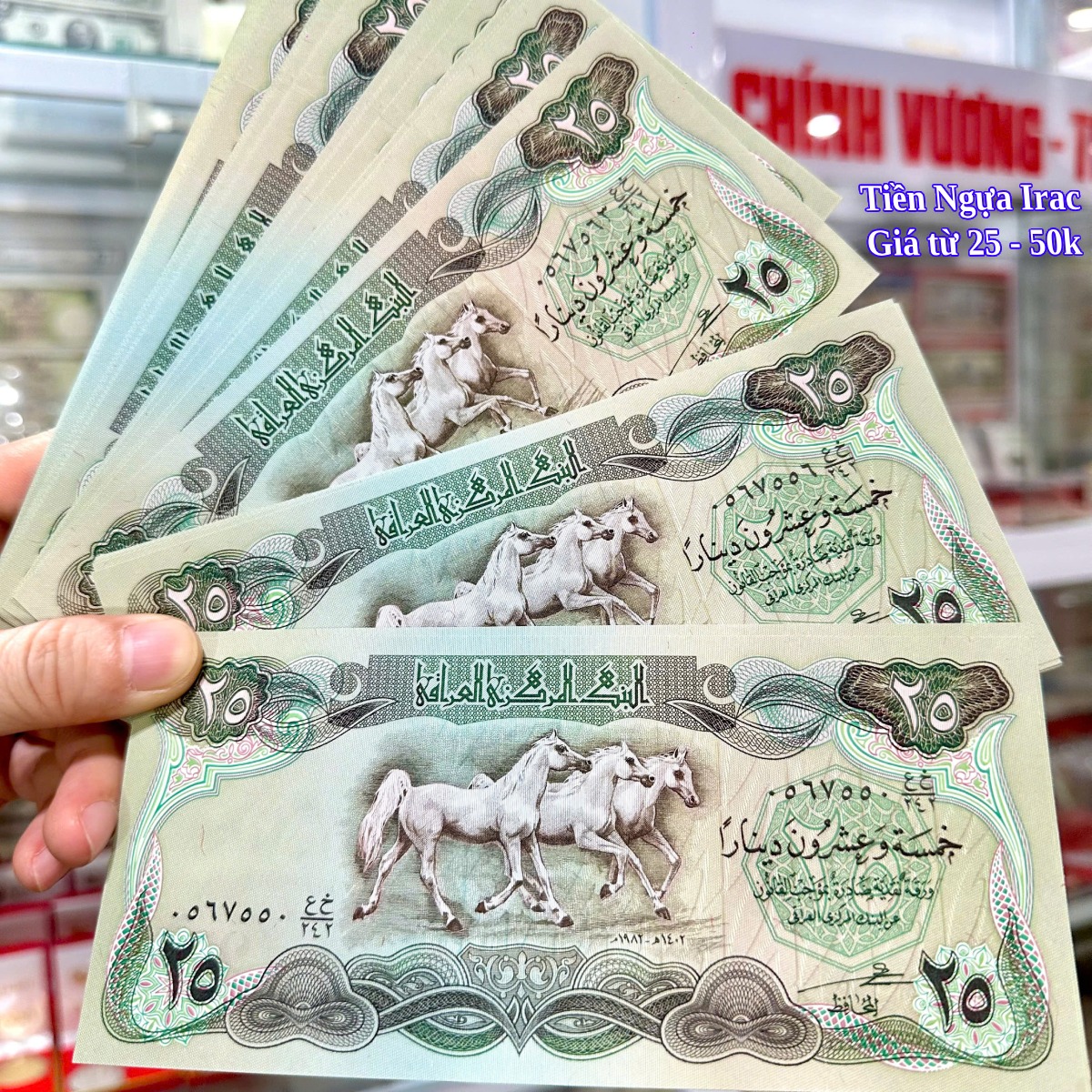Tiền Con Ngựa Mã Đáo Thành Công của nước Irac có in hình Ngựa 3 chú ngựa chạy rất oai phong. Tờ tiền có màu xanh hy vọng và có mệnh giá lạ 25 Dinars nên được nhiều người yêu thích làm tiền lì xì đầu năm mới lấy may.