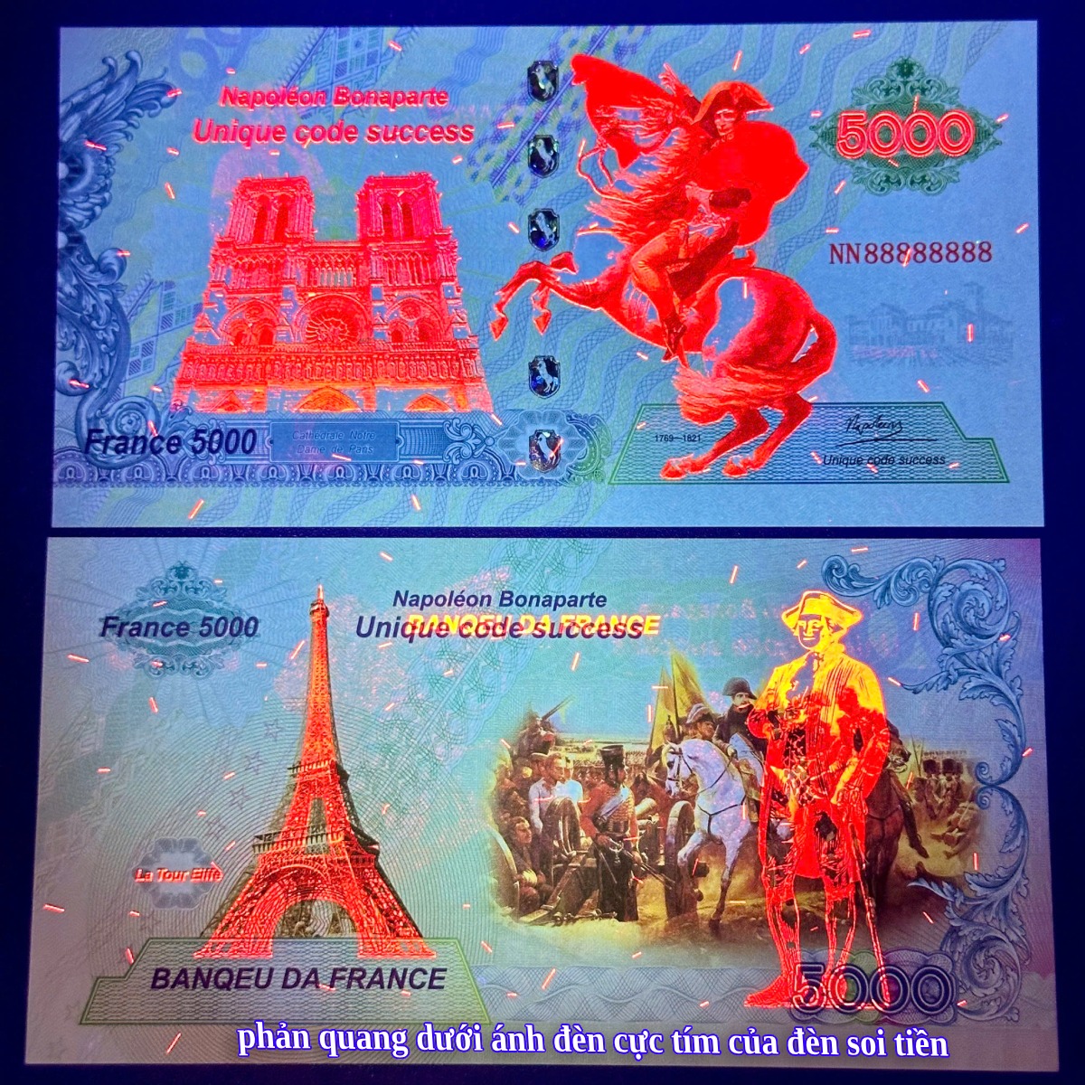 phản quang siêu đẹp dưới ánh đèn cực tím của máy soi tiền, hoa văn, họa tiết cực bắt mắt.